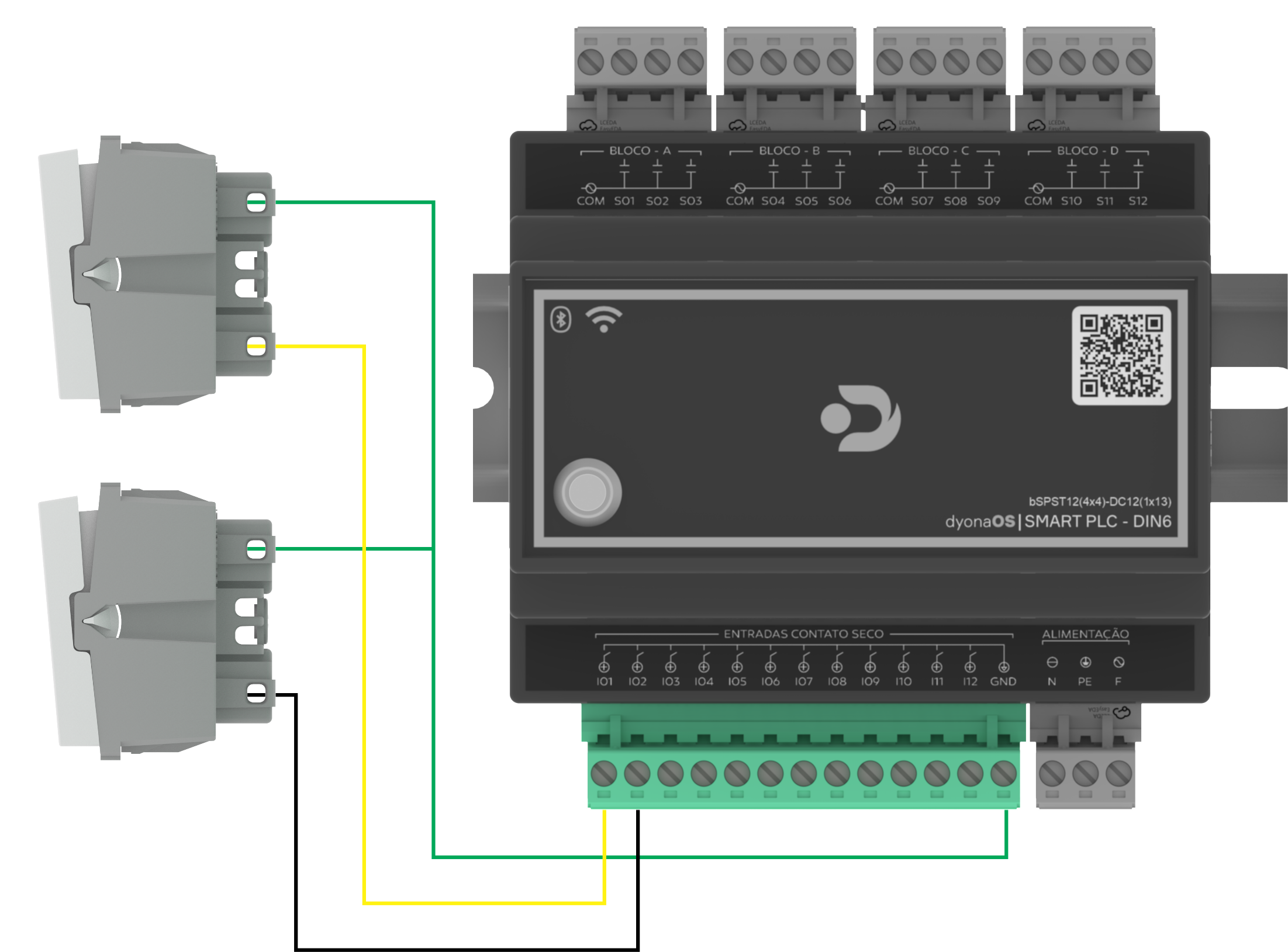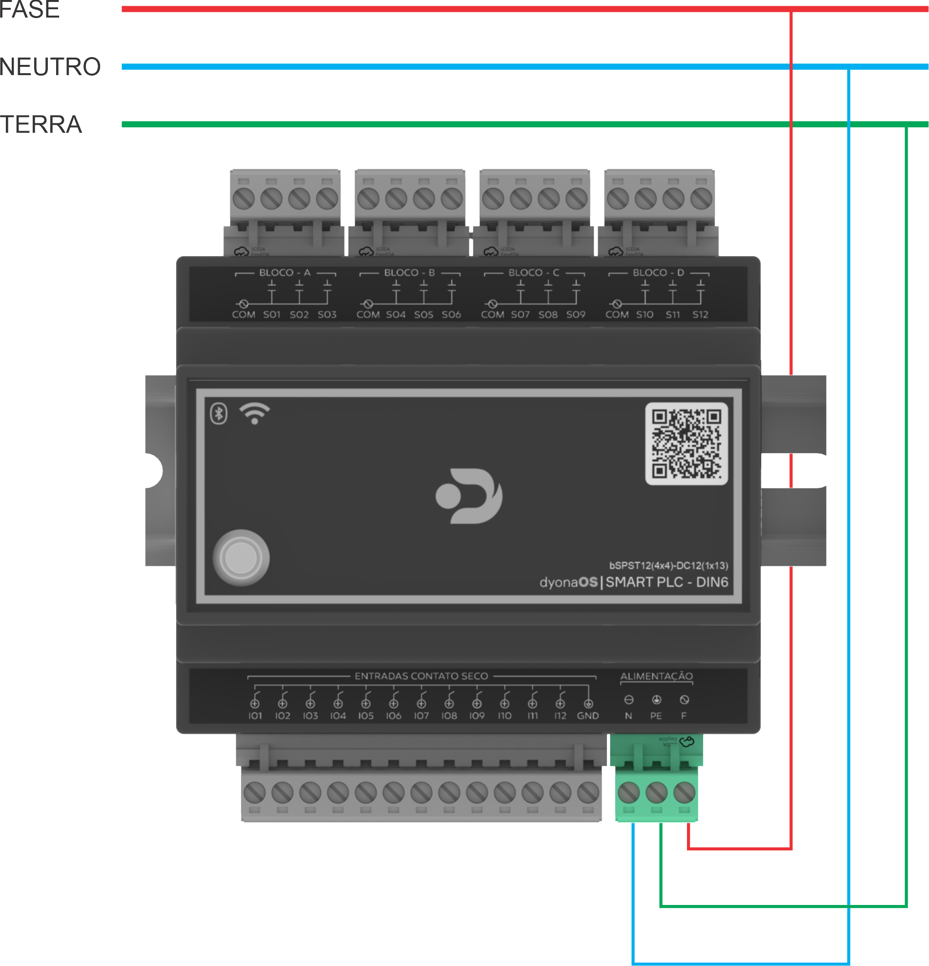Conexão Wi-Fi e Adição à Plataforma: Para conectar o Smart PLC à sua rede Wi-Fi (2,4GHz) e adicioná-lo como um dispositivo digital nas plataformas Dyona SmartPlaces ou Synapse, acesse o guia detalhado completo online: