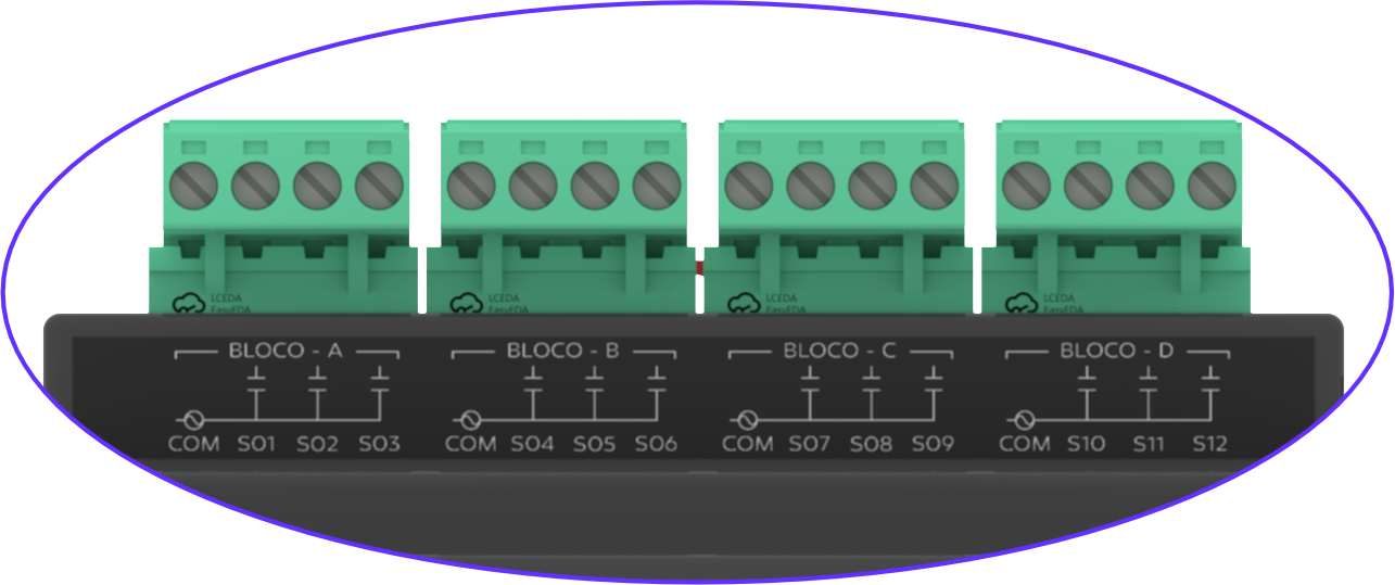 3 - Blocos de Relés (4 conectores 1x4 pinos): Cada bloco possui 3 relés com borne comum e borne de saída